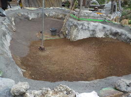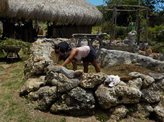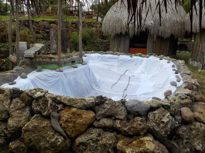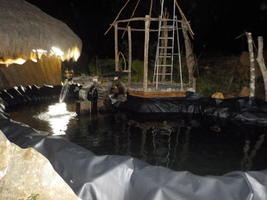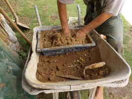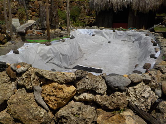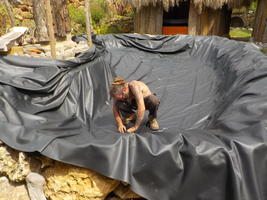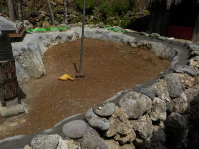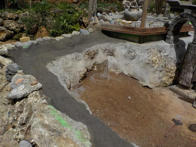 Le temps du bassin est arrivé… l'aqueduc sur les porches en pierre est confectionné, désherbage effectué et nivelage de la terre réorganisé... (chats et chiens avaient prit le bassin vide pour une ère de jeux, voir plus…)