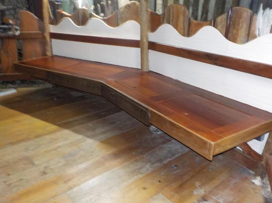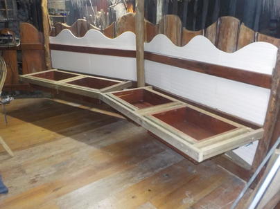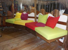 La banquette faite avec des morceaux de meubles, la plupart trouvés en déchèterie. ainsi que les coussins et tissus qui ont servis a les recouvrir, un big-up a titi la couturière internationale !