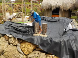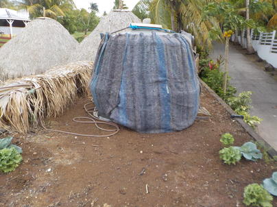 Habillage pour permettre végétalisation de la citerne d'eau de pluie. une couche de feutrine type couverture de déménagement pour garder de l'humidité et qq croutes a bois pour l'esthétisme et que les racines des philodendrons que j'ai placé autour s'y plaisent. la citerne évolutive vas se revêtir dans le temps d'un beau manteau de feuilles … a voir aussi, la frise autour de la toiture végétalisée qui est achevée … le rendu est sympa !