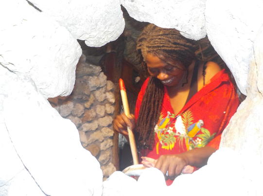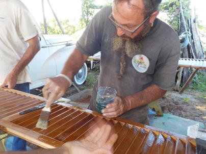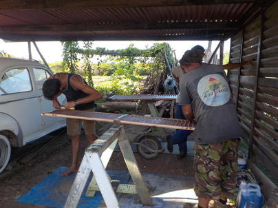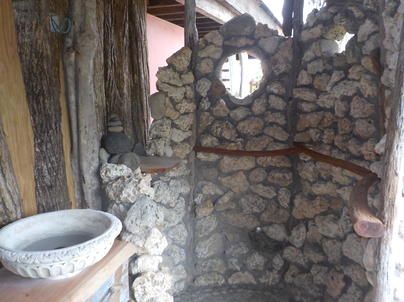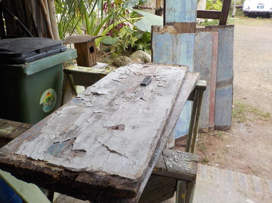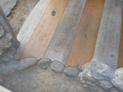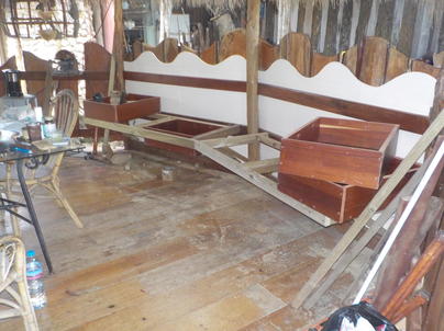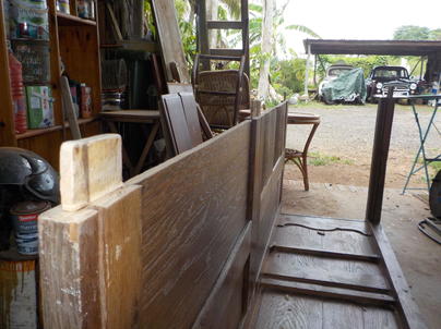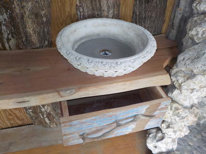 Détail de la liaison entre le plancher et les galets de la douche … utilisation de planches de cases en temps longtemps pour faire les toilettes, les étagères et le tiroir. le plateau du plan de travail est en cajou blanc taillé par nos soins a la tronçonneuse