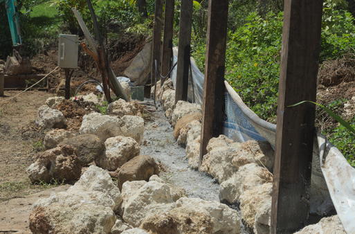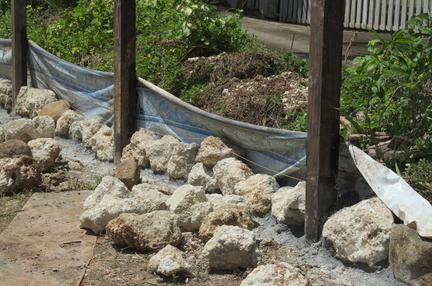 La charpente est quasi prête, on va bientôt commencer à couvrir avec des feuilles de latanier. Ah, oui: et on a les bases du mur de soutènement.