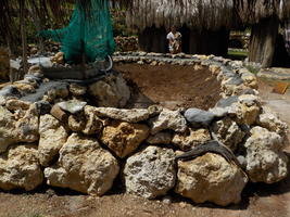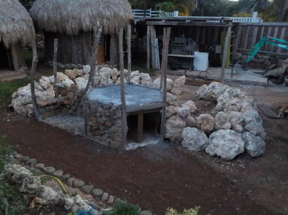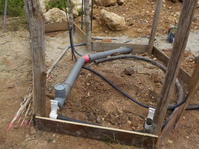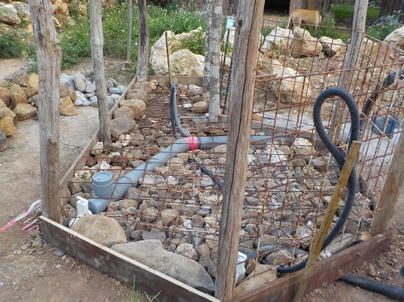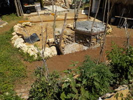 Les murs en pierres se terminent et la terre de devant est mise a niveau. L'électricité et la peinture a la chaux sont posés (ça évitera de se le faire a quatre pattes...). Le coffrage, le banchage, l'évacuation d'eau, le treillis soudé, le tuyau central qui viens de la pompe et le coulage avec sa ceinture de petits galets... ça c'est fait... plus qu'à laisser bien sécher.