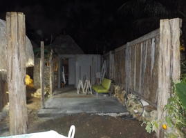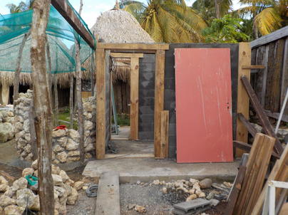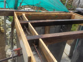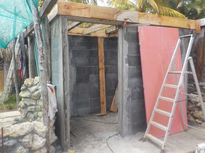 Le local sécurisé a bien avancé, ferraillage, coffrages et coulages sont terminés, les gonds des portes sont incorporés dans les encadrements qui eux-mêmes ont été coulés dans la masse. les portes que l'on aperçoit sont de type coupe-feu, récupérées a la déchét'... l'enduit des murs a aussi été réalisé.