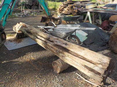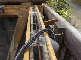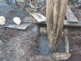 Mise en place du deuxième poteau d'entrée du garage de la 403, il a fallu extraire de sous terre un gros caillou qui se trouvait juste a cet endroit. Obligé de faire un coffrage dans le cratère ainsi formé, et le poteau est debout face à sa moitié ...