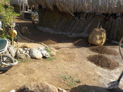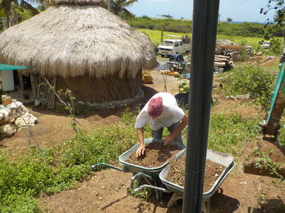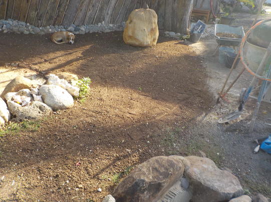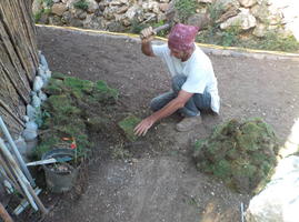 voici une des facette de la finition: mettre la terre a son niveau définitif et y planter l'herbe. vous remarquerez la technique expéditive de division des touffes de zoïza par david… dés leurs mise en position elles sont plantées dans la foulée. plus qu'a désherber les zebs squatteuses de temps a autre et patienter quelques lunaisons...