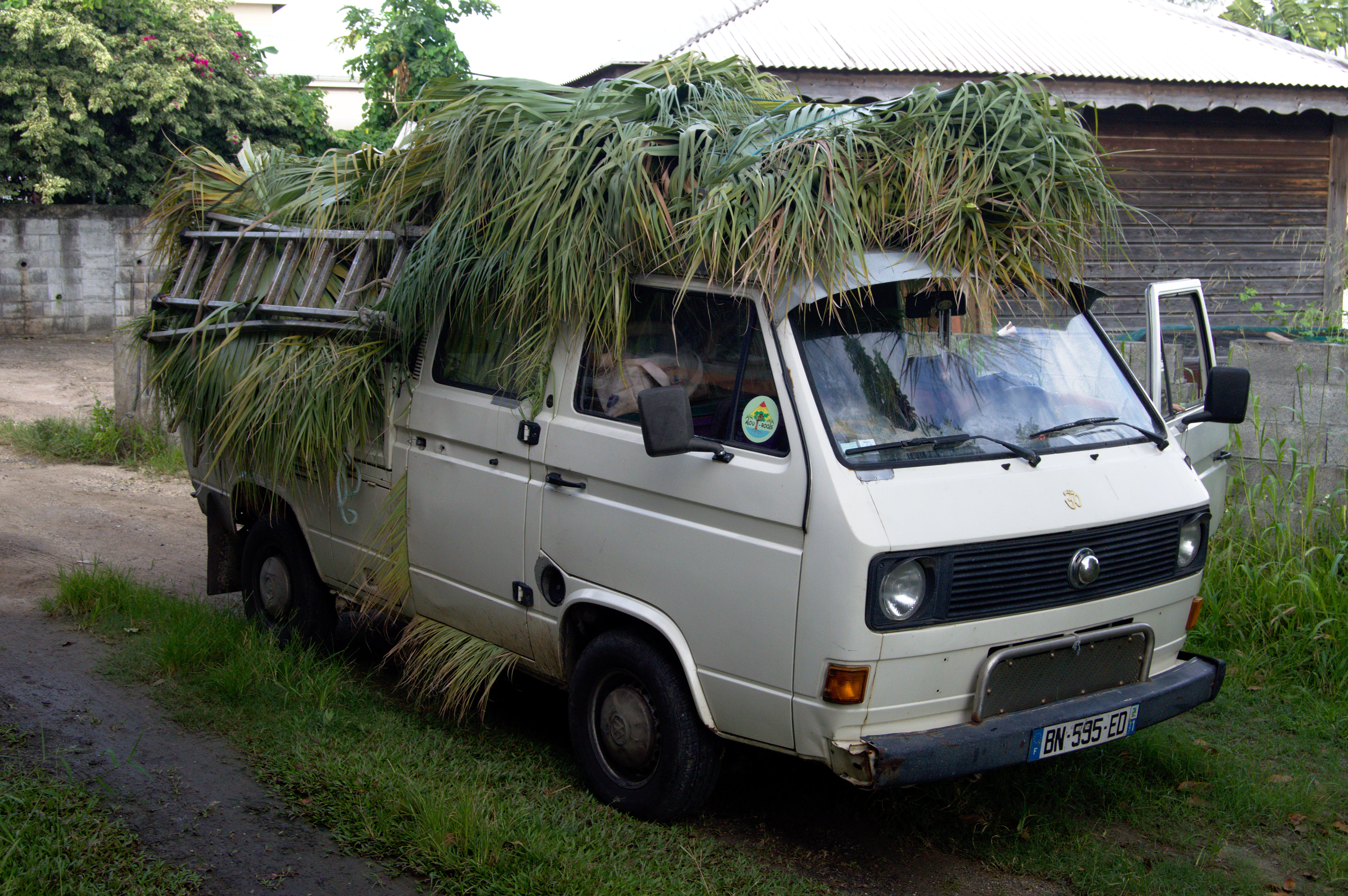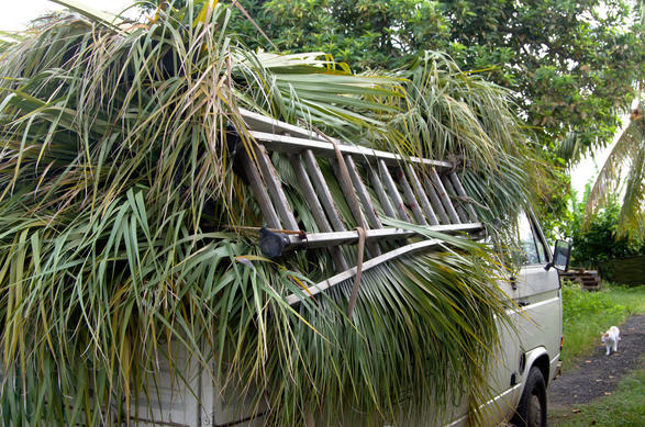 Une nouvelle livraison de feuilles de latanier, pour finir le toit. Le camion est rempli jusque dans les moindres recoins!
