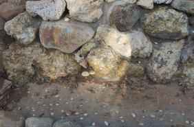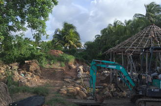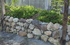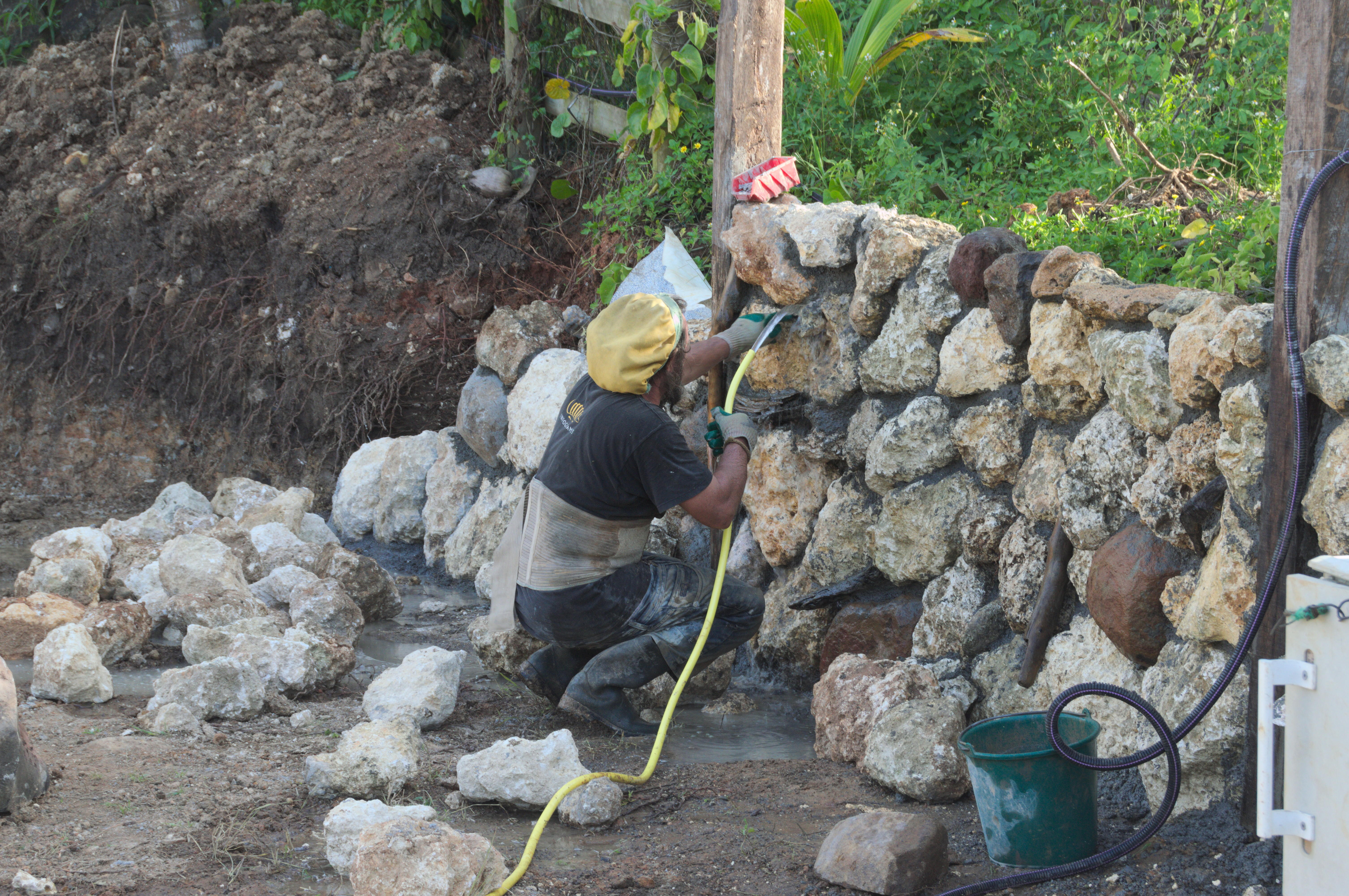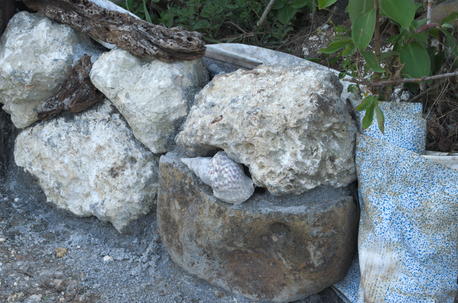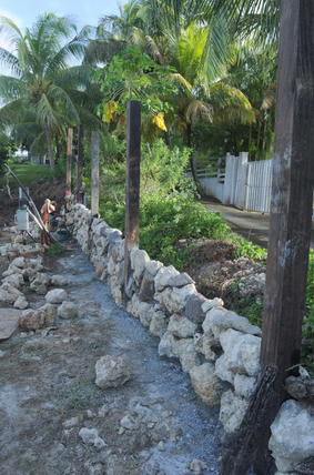 Le mur de base est fait à partir de tuf, pierre formée par la compression du récif coralien (couleur jaune paille). Le mur supérieur de soutènement, lui, est fait de roches volcaniques (couleur grise). Soigneusement assemblés pour joindre l'esthétique à l'efficacité, on y insère ci et là des fossiles, coquillages, ou autres éléments originaux.