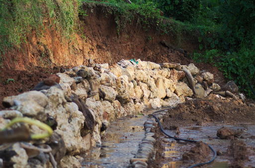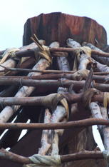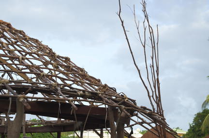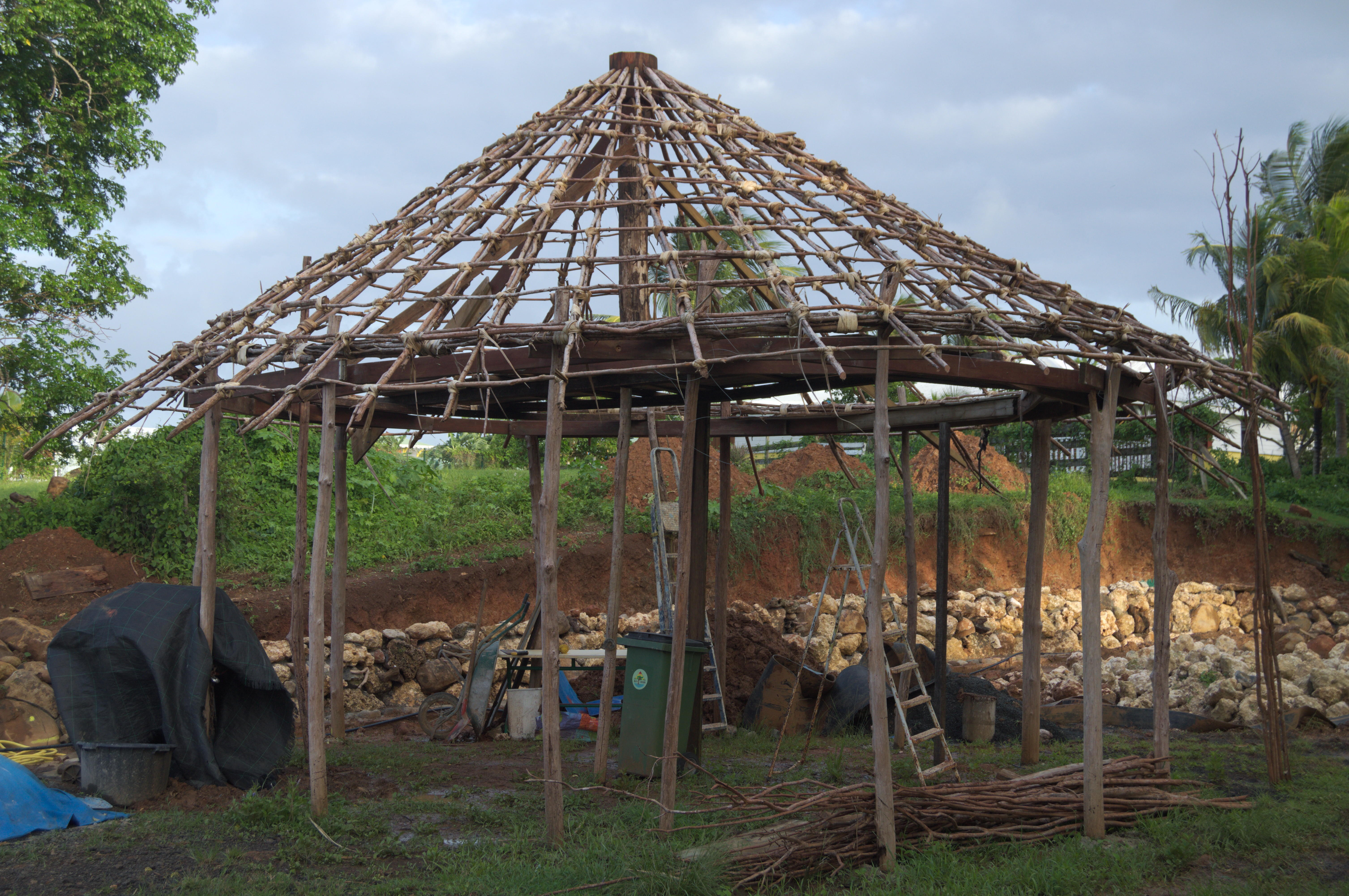 La charpente est quasi prête, on va bientôt commencer à couvrir avec des feuilles de latanier. Ah, oui: et on a les bases du mur de soutènement.