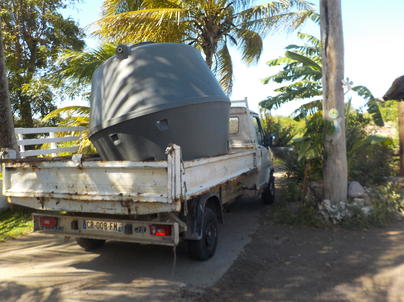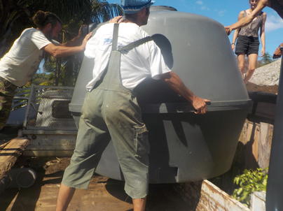 Mise en place sur la toiture végétale de la citerne d'eau de pluie.