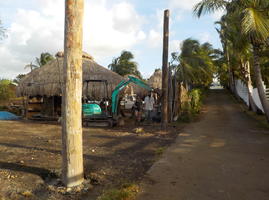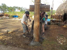 Seuils d'entrées en galets et pierres plates pour les chambres, début de la dalle de sol pour le local technique et mise en place du deuxième poteau du porche de l'entrée du parking...