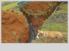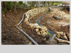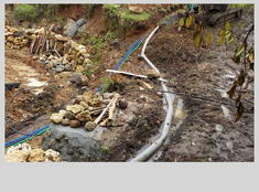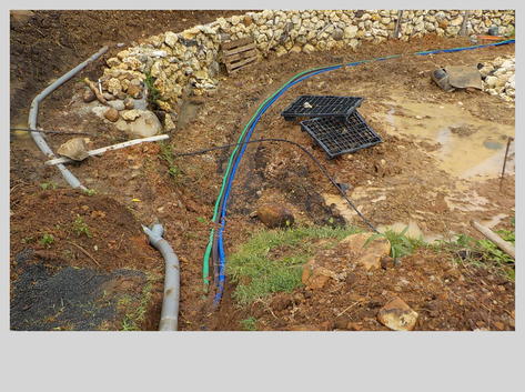 Une des parties chiantes est l'enfouissement des tubes et câbles par temps de pluie, on creuse la tranchée, on y met le sable et une pluie tropicale passe... tout le sable se retrouve dans le point bas, donc on recommence... finalement le tube d'alimentation de la citerne est en place, il fait environ 70 mètres de longueur et contiendra en continu un peu moins de 200 litres d'eau de pluie qui serviront à l'eau quotidienne de la volière. les trois autres gaines sont l'alimentation d'eau, d'électricité et téléphone d'une autre construction a venir...