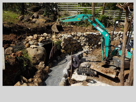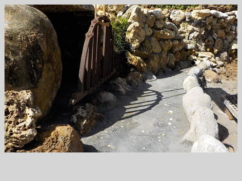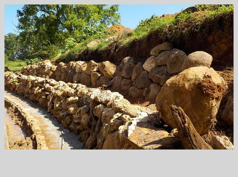Le canal d'évacuation qui accueille toute l'eau de ruissèlement du terrain du haut est enfin terminé. Il vas jusqu'à l'escalier de corail et est bordé par des jolis galets polis par la mer, ceci a permis de faire dans la lancée la première rangée des roches de la fin du mur en roches tuf qui accueillera sous peu le soupirail ancien placé devant la grotte des chauves souris... la dernière photo montre la deuxième rangée en place sur le mur de soutènement en roche volcaniques...