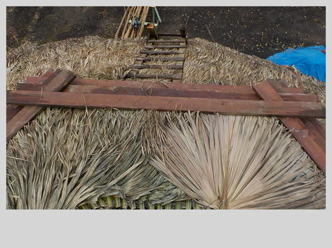 Confection d'un échafaudage hexagonal qui permet d'accéder au faîte et de ce fait à réaliser le chapeau de finition de la toiture. vous remarquerez les tiges des feuilles encore vertes... et pas les trous dans mes grolles...