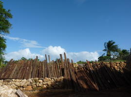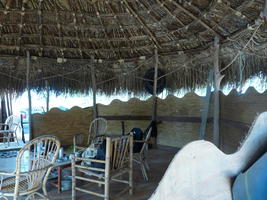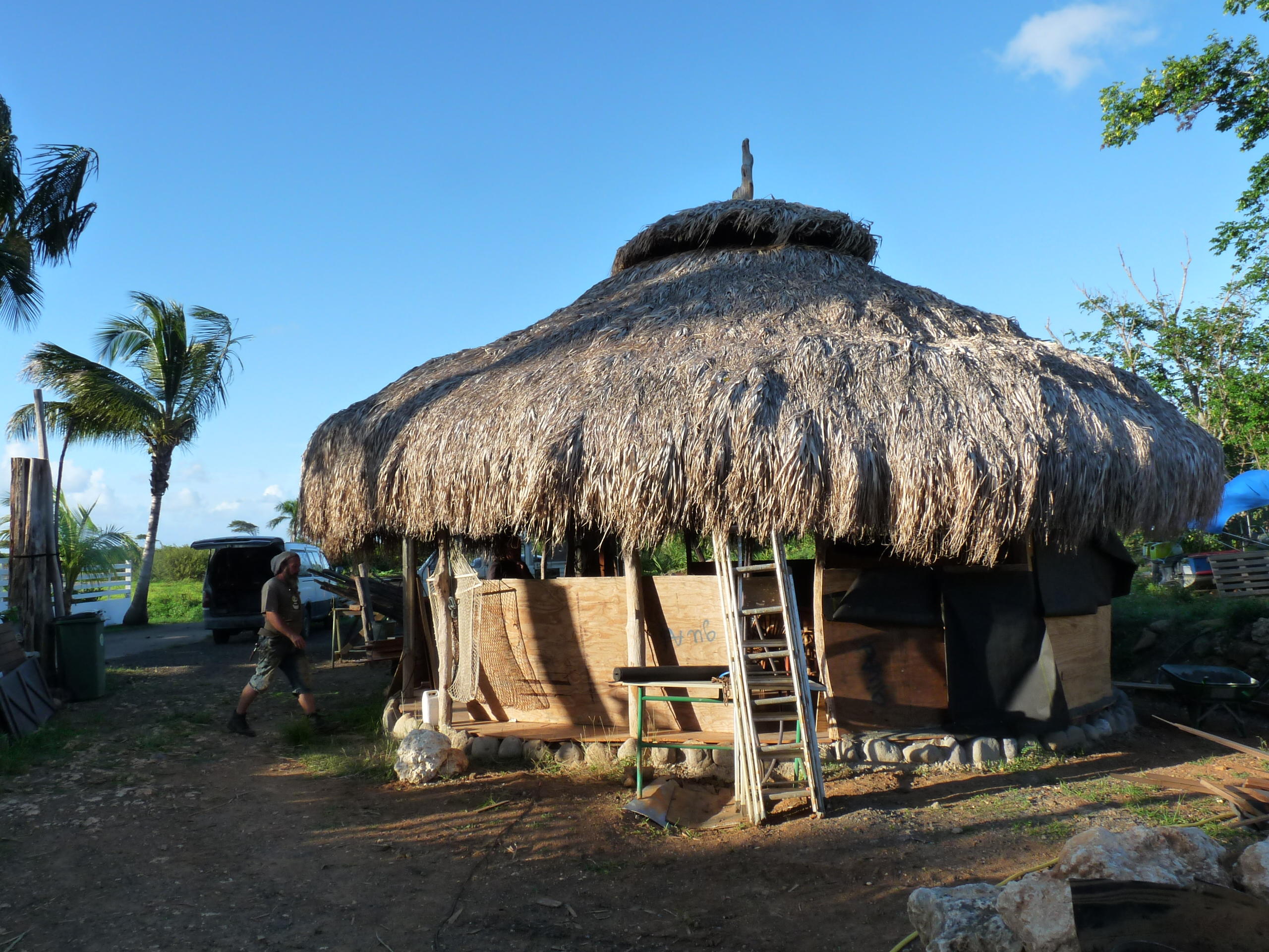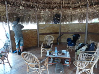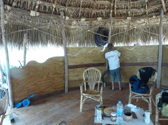 le coté "au vent" de la grande paillotte est protégé par un contreplaqué découpé en vagues et va être recouvert a l'extérieur par des croutes de bois