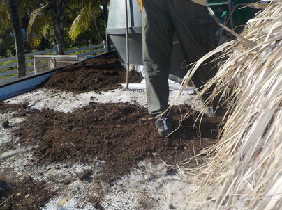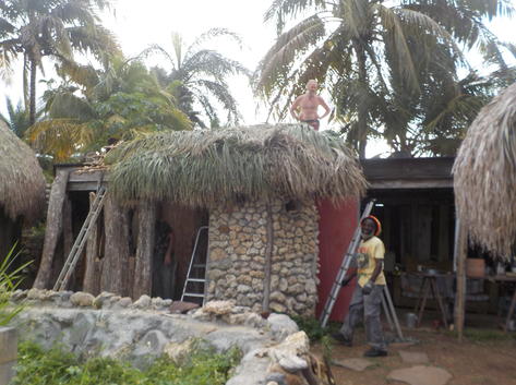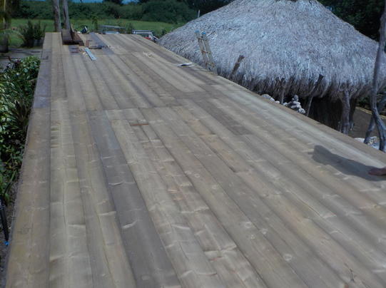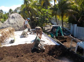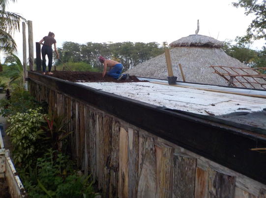 salut a tous et toutes, les actions se font dans en suivant les courbes du moment et là il est bien temps de mettre quelques photos. la toiture végétalisée a bien avancée et nous avons hissé sans efforts la terre sur le toit. Y a entre 12 et 15 cm partout. on a déjà testé quelques plantations, salades, cives, choux, carottes …