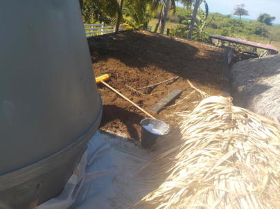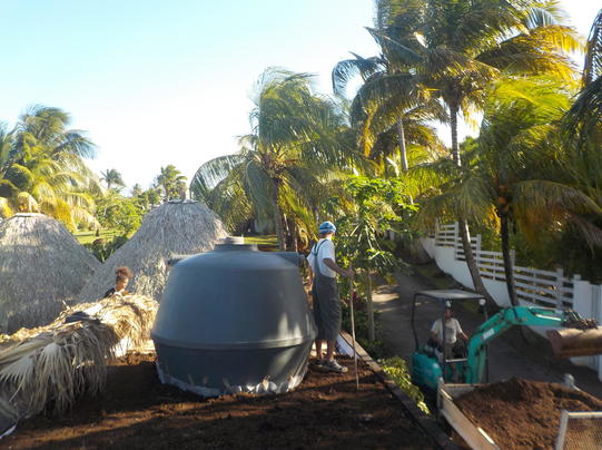 Mise en place sur la toiture végétale de la citerne d'eau de pluie.